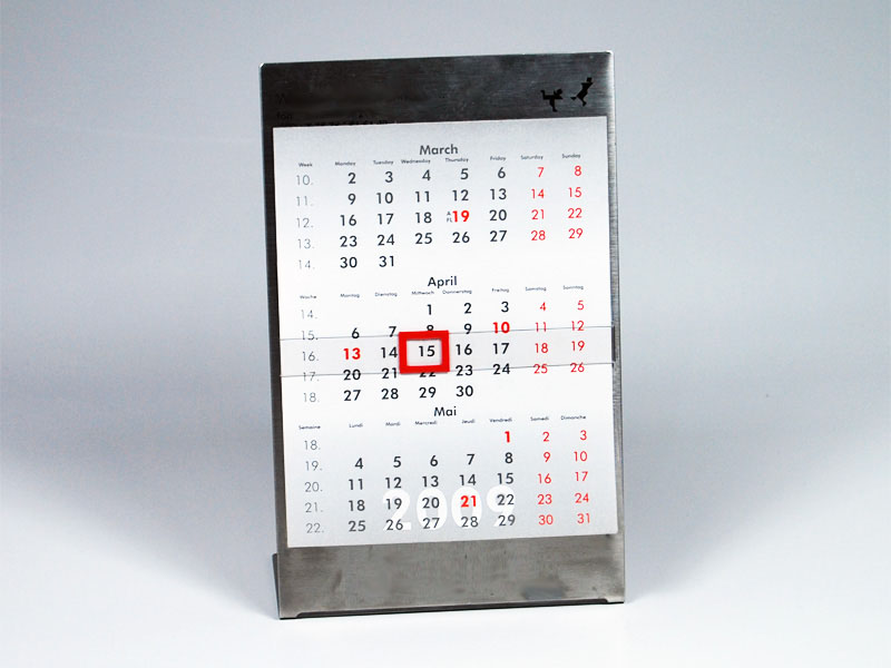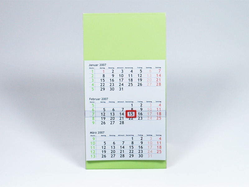 Das Fenster wird an einem Hart-PVC-Trägerband angebracht. Das Trägerband ist an den Seiten umgebogen und hält durch Klemmwirkung an der aktuellen Seite (Variante "Blatt") oder an allen Seiten (Variante "Block") des Kalenders. Diese Version wird bevorzugt an Tischkalendern eingesetzt.