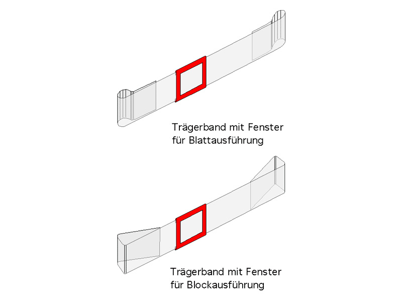 Das Fenster wird durch uns auf das Trägerband "geknipst" und á 1.000 Stk. lose in Kartons verpackt. Gegen Aufpreis ist auch eine Verpackung á 50 Stk. in Polybeuteln möglich.